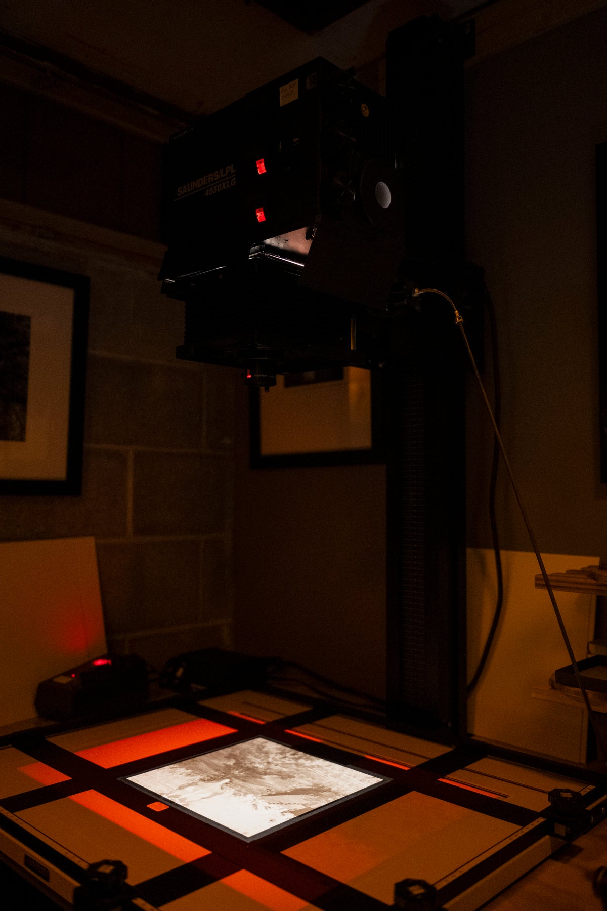 Once an image is selected, I meticulously clean the negative and place it into the enlarger. This optical system projects the image onto photographic paper, allowing precise control over cropping, magnification, and contrast. My carriers are configured for selective masking, a process that provides localized control over exposure and expands my expressive range as a printer.